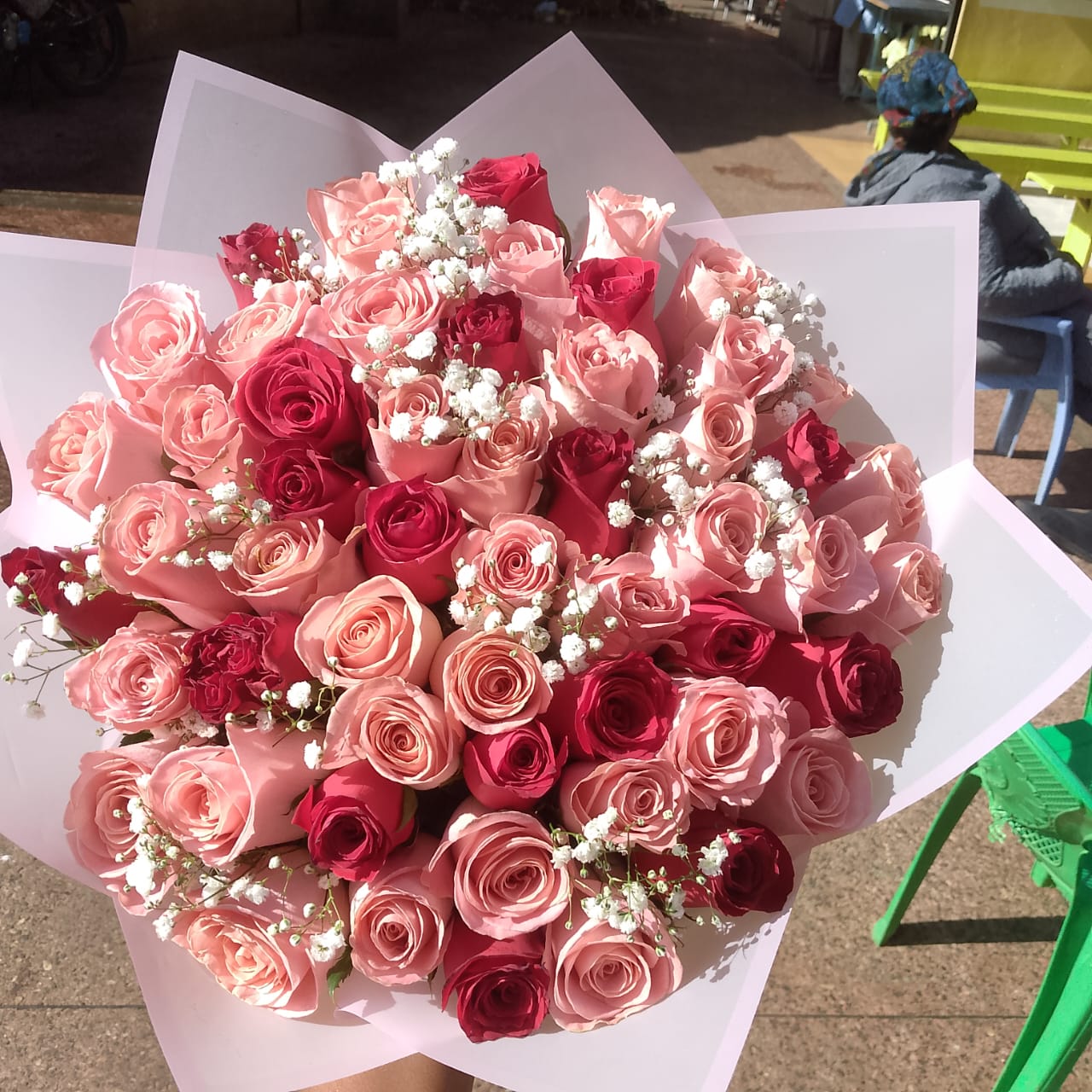 Nothing speaks the language of love quite like the timeless combination of red and pink roses. This dense, lush arrangement from Kingpin Flowers features deep crimson buds nestled among soft pink petals, lightly dusted with delicate white gypsophila. It is a classic choice for wedding anniversaries, marriage proposals or Valentine’s Day. Each stem is hand-selected for its symmetry and fragrance, ensuring a premium floral experience. Order today for seamless flower delivery and let these blooms express what words cannot.