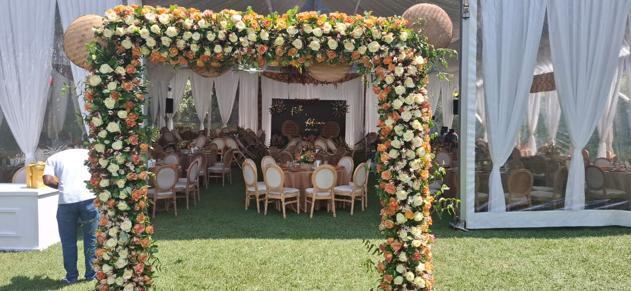 Create a breathtaking entrance for your special day with this majestic floral arch. Hand-crafted with hundreds of premium ivory and peach roses and seasonal greenery, this arch provides a stunning backdrop for wedding ceremonies and photography. Kingpin Flowers specializes in high-end wedding flowers in Kenya, offering full-service design and installation. This grand arch is a symbol of new beginnings and romantic luxury. Our expert team provides dedicated delivery and setup in Nairobi, ensuring that every bloom is perfectly placed to make your wedding day as beautiful as you have always imagined. Contact us for custom sizing.