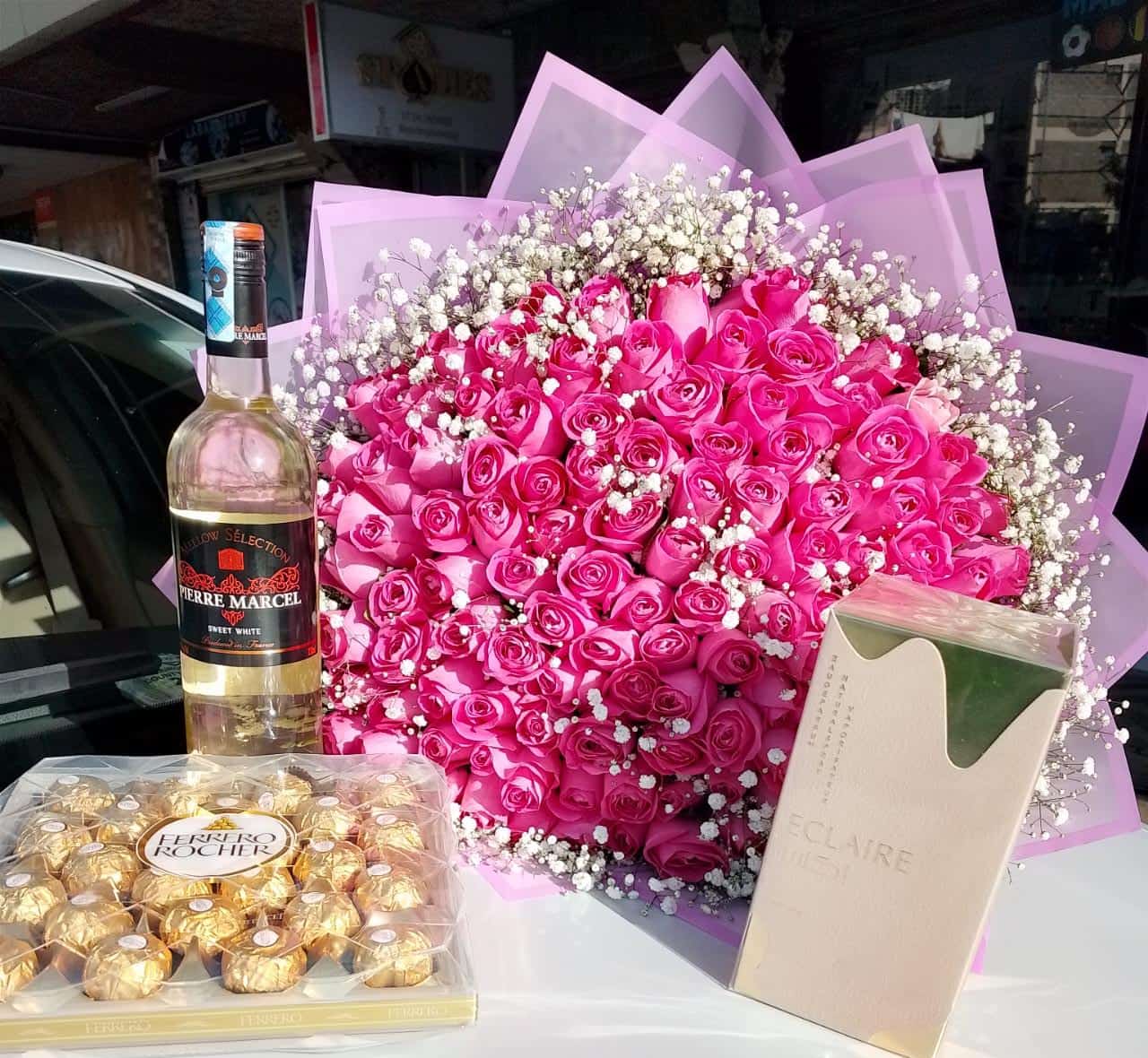 For those who wish to make a lasting impression, this set pairs a massive, hand-tied bouquet of hot pink roses with premium accompaniments. The arrangement is overflowing with blooms and delicate baby’s breath, creating a cloud of floral beauty. Designed for momentous celebrations, this gift signifies luxury and abundance. As the premier choice for an online flower shop in Kenya, Kingpin Flowers offers curated sets that combine the finest local roses with world-class presentation for your most important anniversaries and events.