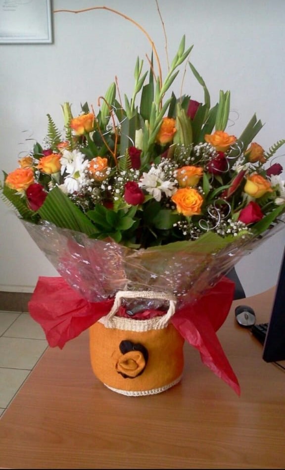 This rustic yet refined arrangement is presented in a charming woven basket, featuring a vibrant mix of orange bi-color roses, red buds, and white daisies. The inclusion of tall gladioli stems adds height and a sense of movement to the piece. Ideal for office desks or home side tables, this basket brings the freshness of a Kenyan garden indoors. Kingpin Flowers provides versatile options for flowers in Kenya ensuring that every gift is as practical as it is beautiful.