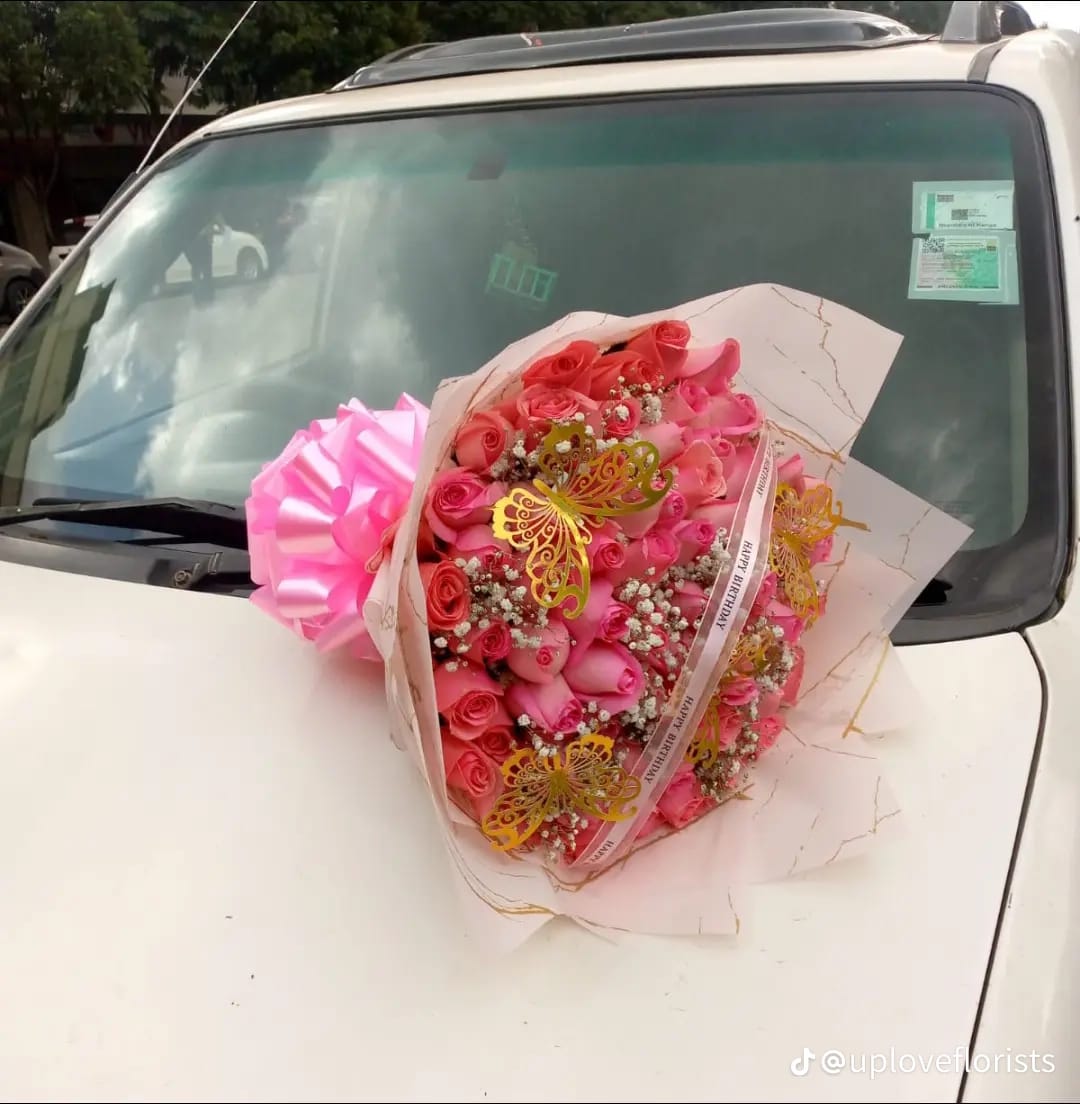 Celebrate a special day with this voluminous arrangement of soft pink roses, delicately interspersed with white gypsophila. This bouquet is elevated by the addition of golden filigree butterfly ornaments and a signature oversized satin bow, creating a whimsical and celebratory feel. For the most dependable flower delivery in Nairobi, Kingpin Flowers offers these bespoke touches to ensure your gift stands out. It is the perfect choice for those seeking a grand, feminine gesture for a significant birthday.
