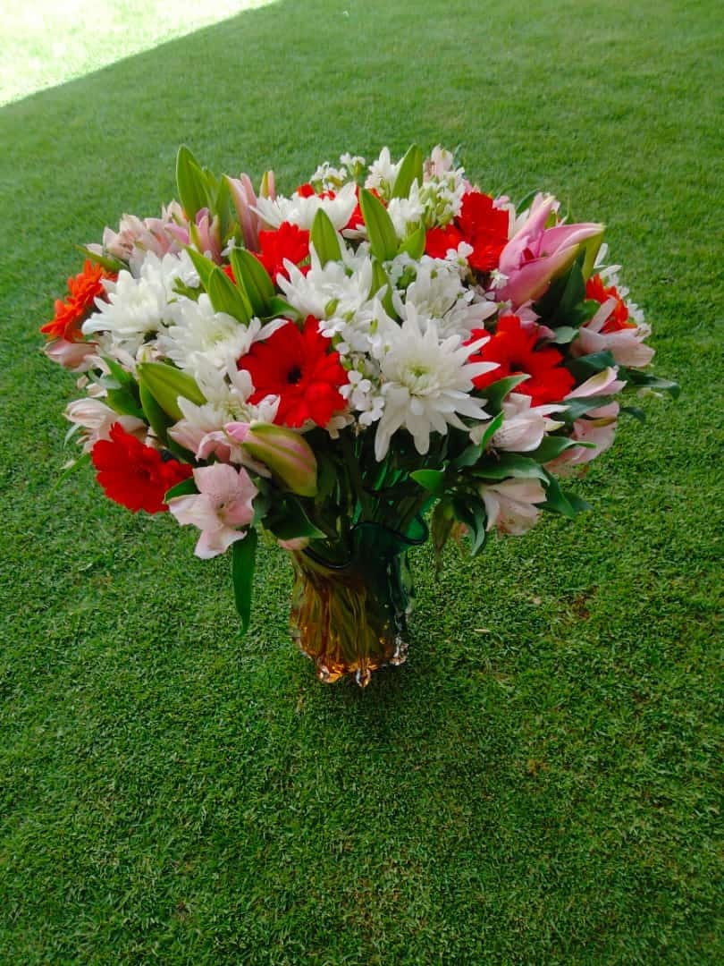 Brighten any tabletop with this cheerful and diverse garden arrangement. Featuring bold red gerberas, elegant white lilies and soft pink alstroemeria, this bouquet is presented in a stylish glass vase. This “ready-to-display” gift is perfect for birthdays or as a center piece for celebratory dinners. At Kingpin Flowers, we believe in the power of color to transform a space. As a leading online flower shop in Kenya, we provide hand-selected blooms that are as fresh as they are beautiful. Enjoy reliable flower delivery in Nairobi for this stunning, pre-arranged floral piece that requires no further setup upon arrival.